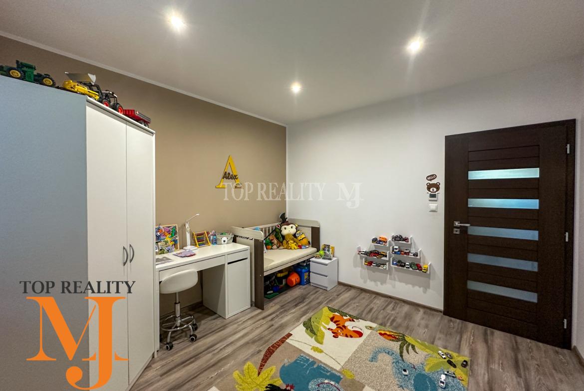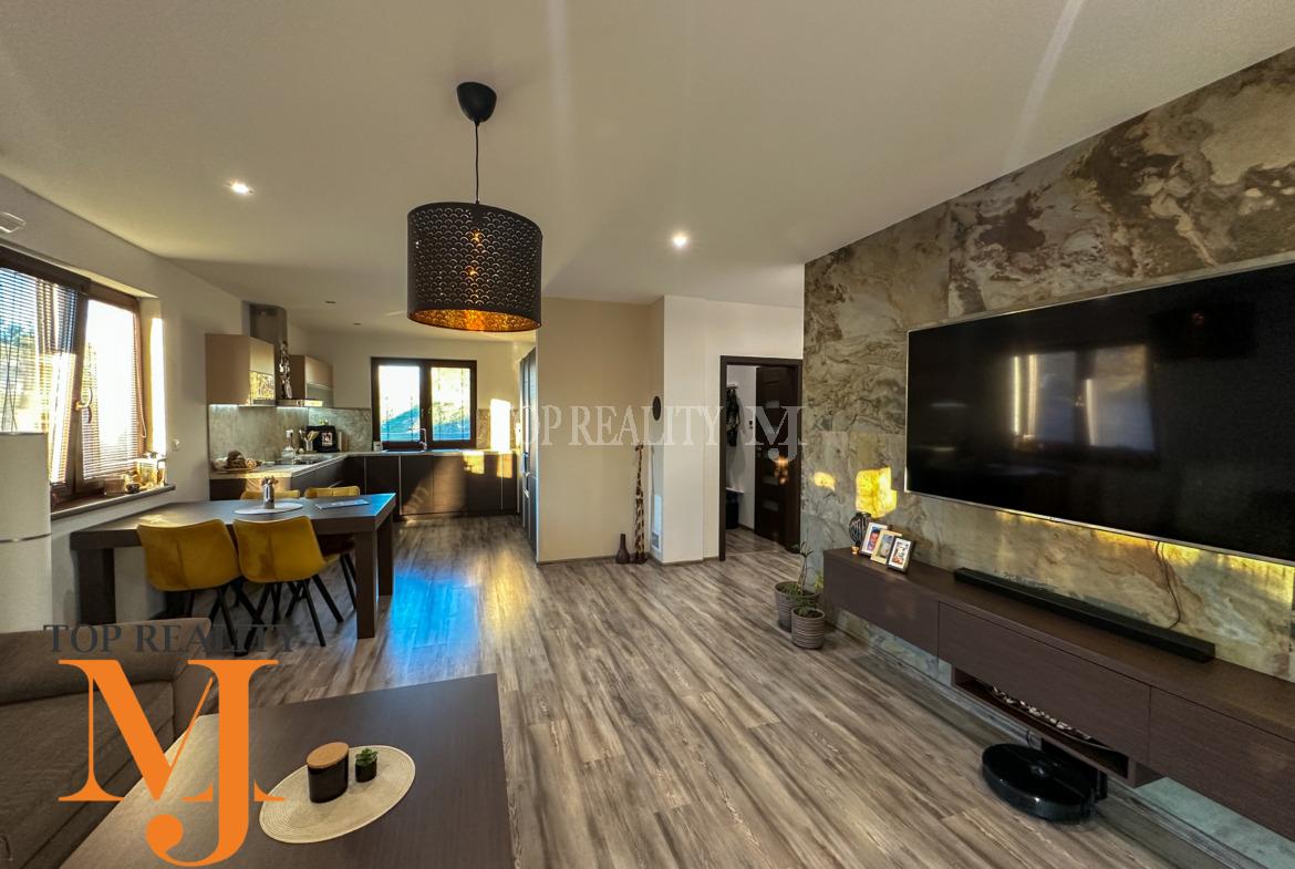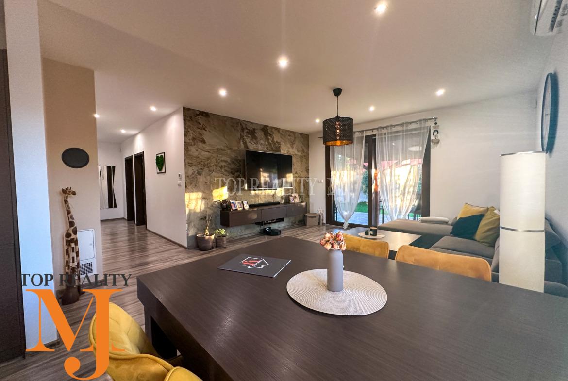 Vstupná chodba s úložnými priestorom, vstup na povalu, chodba ktorá predeľuje dennú aj nočnú časť domu. Dennú časť tvorí obývacia časť prepojená s jedálňou a kuchyňou so zabudovanými spotrebičmi / chladnička s mrazničkou, umývačka riadu, mikrovlnka, rúra na pečenie, varná doska/. Kvalitná kuchynská linka vyrobená na mieru s kuchynským stolom a závesnou komodou pod TV. V obývacej časti sa dával dôraz na kvalitu, ktorú tvorí kvalitná kamenná dyha za televízorom. Priestranná kúpeľňa s vaňou, sprchovým kútom , umývadlom a priestorom pre automatickú pračku a sušičku, samostatná toaleta. Nočnú časť tvoria tri samostatné nepriechodné izby z toho dvoch ostávajú skrine na mieru . V každej izbe je samostatný termostat.