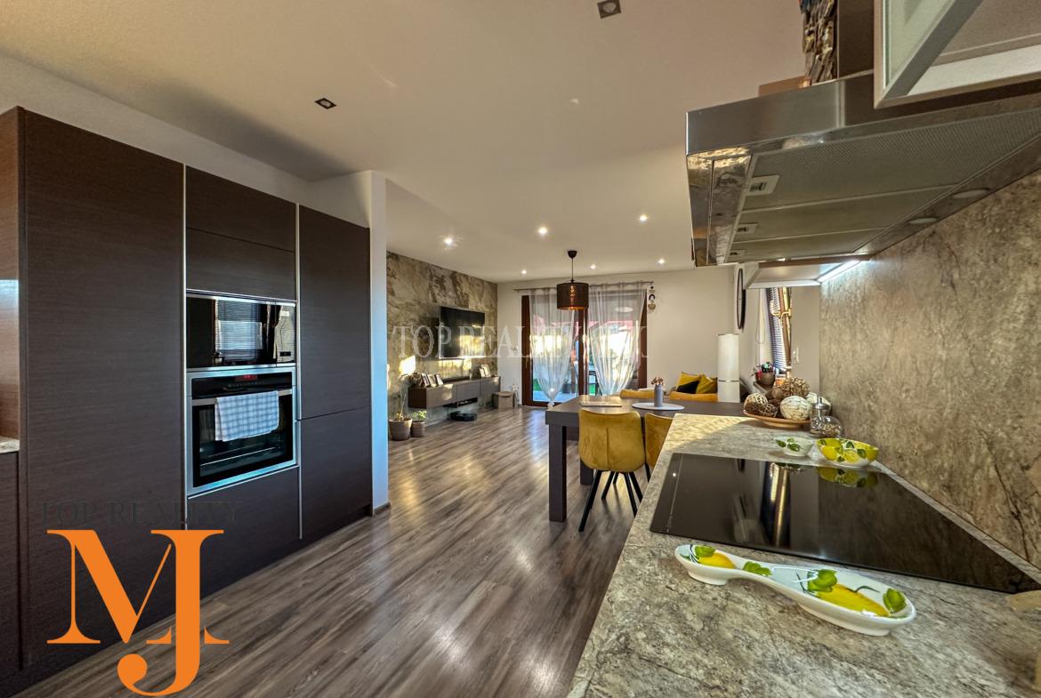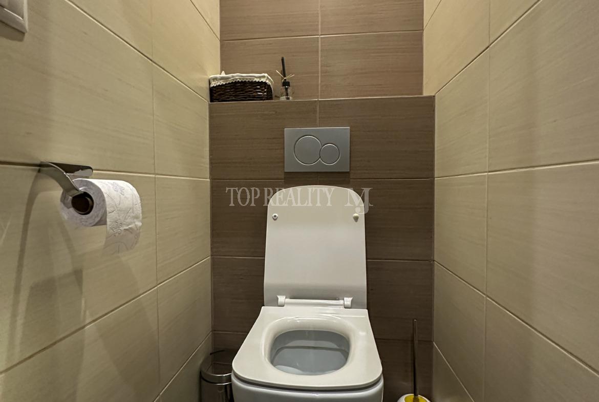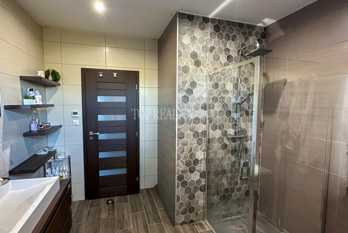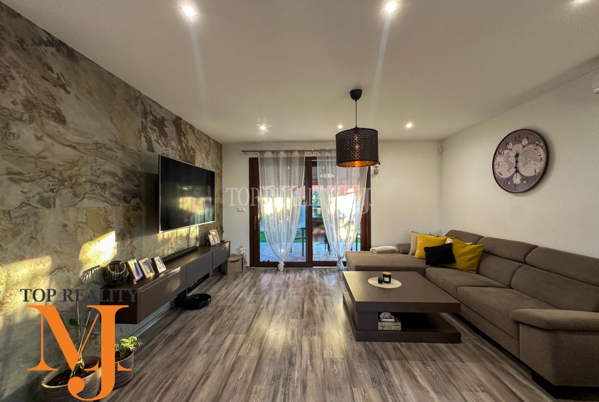 Vstupná chodba s úložnými priestorom, vstup na povalu, chodba ktorá predeľuje dennú aj nočnú časť domu. Dennú časť tvorí obývacia časť prepojená s jedálňou a kuchyňou so zabudovanými spotrebičmi / chladnička s mrazničkou, umývačka riadu, mikrovlnka, rúra na pečenie, varná doska/. Kvalitná kuchynská linka vyrobená na mieru s kuchynským stolom a závesnou komodou pod TV. V obývacej časti sa dával dôraz na kvalitu, ktorú tvorí kvalitná kamenná dyha za televízorom. Priestranná kúpeľňa s vaňou, sprchovým kútom , umývadlom a priestorom pre automatickú pračku a sušičku, samostatná toaleta. Nočnú časť tvoria tri samostatné nepriechodné izby z toho dvoch ostávajú skrine na mieru . V každej izbe je samostatný termostat.